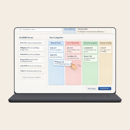 Echo is an interactive Bible verse organization app that allows users to sort and categorize Scripture by themes such as peace, hope, and strength... Built with Next.js, TypeScript, and dnd-kit, the app features drag-and-drop functionality and persistent state using localStorage, creating a smooth and intuitive user experience. Echo demonstrates my ability to manage complex state, implement dynamic UI interactions, and build meaningful faith-based applications.